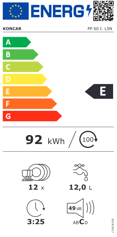 Končar PP 60 I.L5N Ugradbena perilica posuđa Končar Broj kompleta posuđa: 12 Broj programa: 5 Temperature (°C): 40-50-55-65 Upravljanje: elektroničko Zaštita od procurivanja Zaštita od pregrijavanja Pretpranje Eco Intenzivno 65°C Brzo Normal 55°C Tipka odabira programa Tipka odgode pranja Pokazivač razine sredstva za sjaj Pokazivač razine soli Pokazivač ciklusa pranja Podesiva gornja košara Broj polica za šalice: 2 Košarica za pribor za jelo Razred energetske učinkovitosti: E Potrošnja vode (l): 12 Potrošnja energije (kWh/100 ciklusa): 92 Potrošnja energije (kWh/ciklus): 0,923 Razina buke (dB): 49 Visina/ Širina/Dubina (cm): 81,5/59,5/55 Ambalaža (V x Š x D ) (cm): 86,1/66,1/64,4 Bruto/Neto težina (kg): 42/40