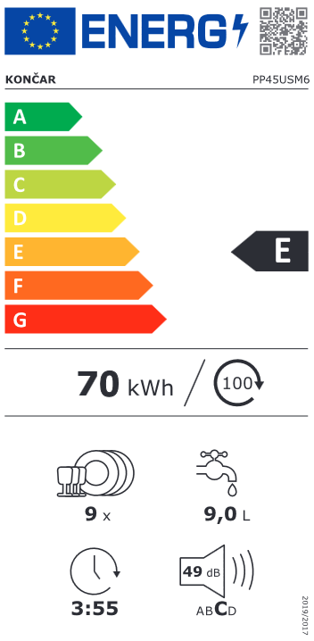 Končar PP45USM6 Izvedba: ugradbena Boja: srebrna Broj kompleta posuđa: 9 Broj programa: 6 Temperature (°C): 45-50-55-60-65 Upravljanje: elektroničko Eco Intenzivno Brzo Staklo 90 minuta Univerzalno Roditeljsko zaključavanje Pokazivač razine soli Pokazivač razine sredstva za sjaj Razred energetske učinkovitosti: E Potrošnja vode (lt): 9 Trajanje standardnog programa (h:min): 3:55 Potrošnja energije (kWh/100 ciklusa): 70 Potrošnja energije (kWh/ciklus): 0,704 Razina buke (dB): 49 Visina/ Širina/Dubina (cm): 81,5/44,8/57 Dubina s otvorenim vratima (cm): 115 Ambalaža (V x Š x D ) (cm): 89/49,5/64,5 Bruto/Neto težina (kg): 36/30,5