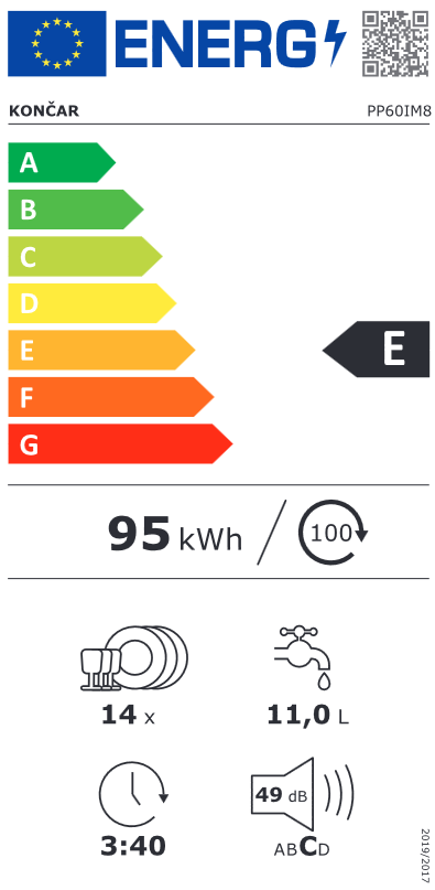 Končar PP60IM8 Perilica posuđa Izvedba: integrirana Boja: srebrna Broj kompleta posuđa: 14 Broj programa: 8 Temperature (°C): 45-50-55-60-65 Upravljanje: elektroničko Automatsko Namakanje Eco Intenzivno Brzo Staklo 90 minuta Univerzalno Display Pokazivač razine soli Pokazivač razine sredstva za sjaj Treća ladica za posuđe Razred energetske učinkovitosti: E Potrošnja vode (lt): 11 Trajanje standardnog programa (h:min): 3:40 Potrošnja energije (kWh/100 ciklusa): 95 Potrošnja energije (kWh/ciklus): 0,951 Razina buke (dB): 49 Visina/ Širina/Dubina (cm): 81,5/59,8/55 Dubina s otvorenim vratima (cm): 115 Ambalaža (V x Š x D ) (cm): 89/64,5/64,5 Bruto/Neto težina (kg): 41,5/34,5