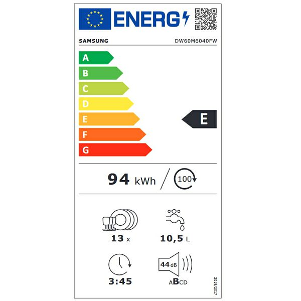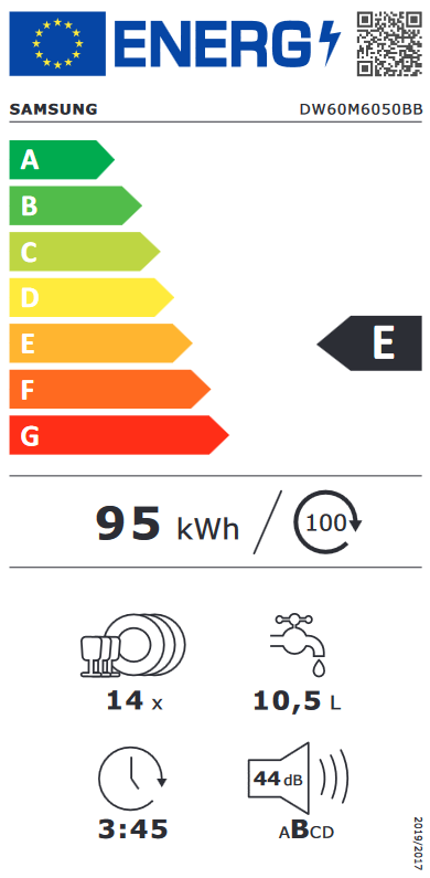 Kapacitet: 14 kompleta Energetska učinkovitost: E Potrošnja vode po ciklusu: 10,5 l Razina buke: 44 dBA 7 programa Odgoda početka pranja Širina: 598 mm Visina: 815 mm Dubina: 550 mm Težina: 43 kg