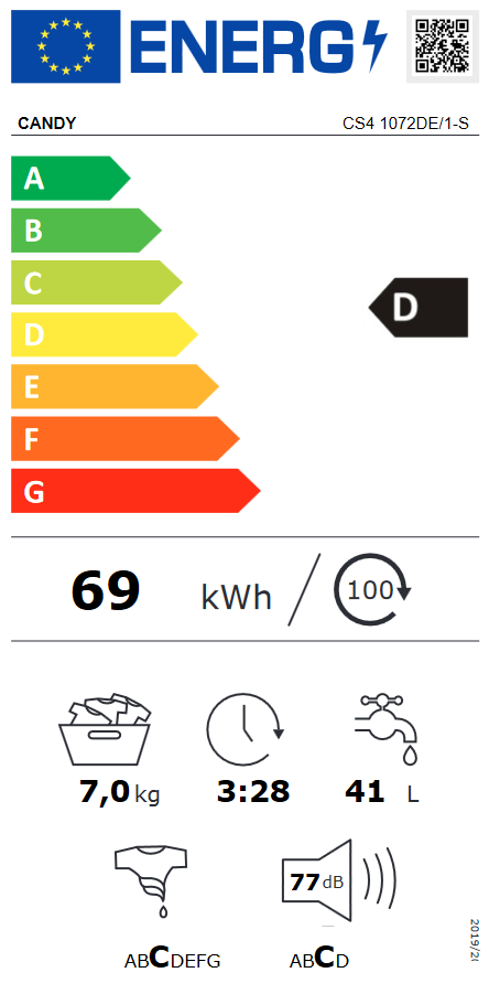 Vrsta punjenja: prednje Nazivni kapacitet - pamuk (kg): 7 Maksimalna brzina centrifuge (okr/min): 1000 Dodatni sadržaj i kontrola blizine (NFC) IoT App: simply-Fi Motor: AC Volumen bubnja (l): 48 Materijal bubnja: inox Broj programa: 16 Odgoda početka do 24 h Boja uređaja: bijela Razred energetske učinkovitosti: D Razred učinkovitosti centrifugiranja: C Ponderirana potrošnja energije na 100 ciklusa za ciklus pranja (za program ECO 40-60°C) (kWh): 69 Trajanje programa ECO 40-60°C za nazivni kapacitet (hh:mm): 3:28 Razina buke tijekom faze centrifuge (dBA): 77 Razred emisije buke koja se prenosi zrakom: C Potrošnja vode po ciklusu pranja (program ECO 40-60°C) (l): 41 Visina: 85 Širina: 60 Dubina: 45 Neto težina (kg): 61