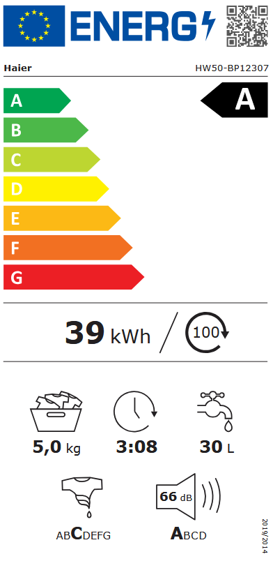 Razred energetske učinkovitosti: A Razred učinkovitosti centrifugiranja: C Ponderirana potrošnja energije na 100 ciklusa za ciklus pranja (za program ECO 40-60°C) (kWh): 39 Trajanje programa ECO 40-60°C za nazivni kapacitet (hh:mm): 3:08 Potrošnja vode po ciklusu pranja (program ECO 40-60°C) (L): 30 Razina buke tijekom faze centrifuge (dBA): 66 Razred emisije buke koja se prenosi zrakom: A Aquastop Broj programa: 6 Odgoda početka do 24h Motor: Inverter BPM Materijal bubnja: Inox Volumen bubnja (l): 32 Napredno upravljanje na daljinu i dodatni sadržaj (Wi-Fi + BLUETOOTH®) Aplikacija za pametno upravljanje: hOn Nazivni kapacitet - pamuk (kg): 5 Maksimalna brzina centrifuge (okr/min): 1200 Samostojeća Visina (mm): 700 Širina (mm): 510 Dubina (mm): 492 Neto težina (kg): 47