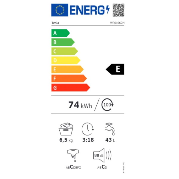 Tesla WF61062M Tesla perilica rublja Prednje punjenje Energetski razred: E Maksimalan broj okretaja: 1000 okr/min Kapacitet pranja kg: 6,5 Klasa pranja: E Klasa sušenja/centrifuge: C Tip ekrana: LED Visina cm: 85 Širina cm: 59.5 Dubina cm: 40 Razina buke - pranje (dB): 59 Razina buke - centrifuga (dB): 80 Kapacitet bubnja l: 39.5 Promjer vrata cm: 28.8 Smjer otvaranja vrata: desno Boja: bijela