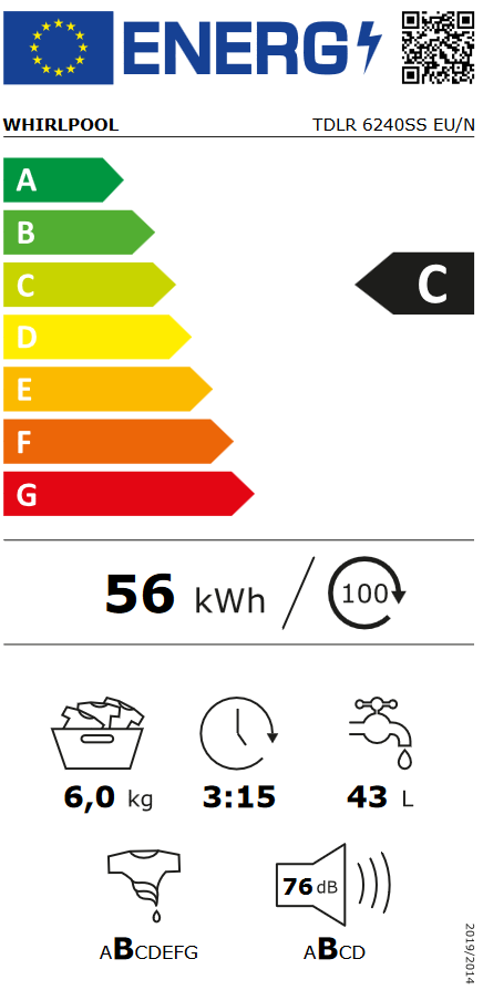 Gornje punjenje Maksimalan kapacitet u kg: 6 Klasa energetske učinkovitosti: C Potrošnja vode u litrama Eco ciklusa: 43 Ponderirana potrošnja energije u kWh/100 ciklusa Eco 40-60 programa: 56 Brzina centrifuge: 1200 okr/min Učinkovitost centrifuge: B Razina buke: 76 dB