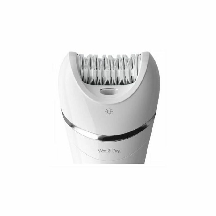 Glatka koža koja traje tjednima uz tehnologiju Double ActionTehnologija Double Action sinkronizira duge keramičke diskove za stabilno prianjanje i uklanjanje dlačica duljine tek 0,5 mm. Široka glava epilatora s 50% dužim diskovima uklanja više dlačica u jednom potezu*. Pripremite se za bezbrižne tjedne tjedne bez dlačica uz malo truda.Uočite i najtanje dlačice s tehnologijom Opti-lightUočite i najtanje dlačice s ugrađenom tehnologijom Opti-light, dovoljno blizu vašoj koži da uhvati preostale dlačice.S dodatnom kapicom za osjetljiva područjaZa jednostavno uklanjanje neželjenih dlačica uz dodatnu nježnost na licu, pazusima i bikini području upotrijebite kapicu za osjetljiva područja.Specifikacije:Dodatna oprema:Torbica OsnovnaČetka za čišćenje DaKapica za osjetljiva područja DaKapica za optimalni kontakt DaSnaga:Vrsta baterije Litij-ionskaPunjenje Brzo punjenje, 2 sata punjenjaVrijeme korištenja do 40 minutaTehničke specifikacije:Napon 15 V / 5,4 WBrzina izvlačenja dlačica 2 70 400 u minutiBrzina izvlačenja dlačica 1 64 000 u minutiBroj diskova 32Značajke:Postavke brzine 2 postavkeJednostavnost uporabe:Bežični DaDrška Drška u obliku slova SVlažno i suho korištenje DaOpti-light DaOdlične radne značajke:Epilacijski diskovi Keramički diskoviIzuzetno široka glava epilatora Da