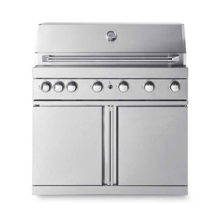 Samostojeći plinski roštilj sa 6 plamenika EAN: 7330066076354 Mjere (Š x V x D) (visina i dubina gornje ploče): 99,5 x 118 x 58 (90,5 x 58) cm Čelik: SS 304 Površina za kuhanje: 97 x 46 cm, 6 snažnih plamenika od nehrđajućeg čelika, roštilj