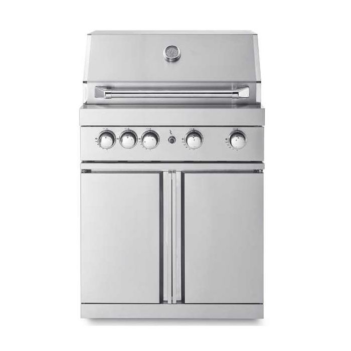 Samostojeći plinski roštilj sa 4 plamenika EAN: 7330066076361 Mjere (Š x V x D) (visina i dubina gornje ploče): 74 x 118 x 58 (90,5 x 58) cm Čelik: SS 304 Površina za kuhanje: 71 x 46 cm, 4 snažna plamenika od nehrđajućeg čelika, roštilj