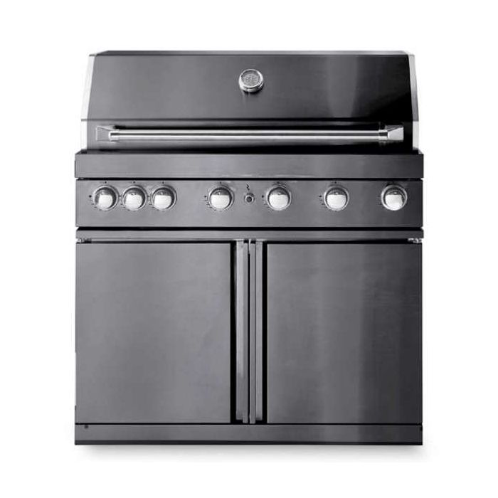 Samostojeći plinski roštilj sa 6 plamenika EAN: 7330066078952 Mjere (Š x V x D) (visina i dubina gornje ploče): 99,5 x 118 x 58 (90,5 x 58) cm Čelik: Black SS 304 Površina za kuhanje: 97 x 46 cm, 6 snažnih plamenika od nehrđajućeg čelika, roštilj
