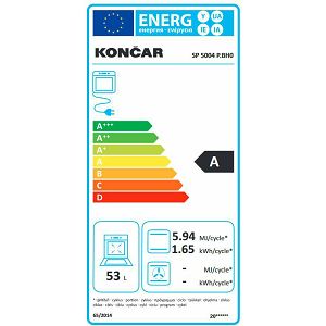 SP 5004 P.BH0Plinski štednjak KončarBoja: bijelaVisina/ Širina/ Dubina: 85/50/60 cmVisina uz podignuti poklopac: 150cmVisina podesiva za: 2 cmPrednje lijevo mjesto za kuhanje: plinski plamenik 3 kWPrednje desno mjesto za kuhanje: plinski plamenik 1 kWStražnje lijevo mjesto za kuhanje: plinski plamenik 1,75 kWStražnje desno mjesto za kuhanje: plinski plamenik 1,75 kWPaljenje električnom iskromPlamenici s osiguranjemRadna ploča: emajliranaNosač posuda: emajliranVisina/Širina/Dubina (unutarnja mjera): 37/31/39 cmBroj funkcija: 1Izvedba pećnice: plinskaRasvjeta pećniceSnaga donjeg grijača: 2,8 kWVučene vodilice tavaRešetka: 1Duboka tava: 1PoklopacPlinski priključak: G30/30 mbarKategorija: II2H3B/PRazred energetske učinkovitosti: APotrošnja energije - klasični način grijanja: plin: 1,65 kWh (5,94 MJ)Korisni volumen prostora za pečenje: 53 lDimenzije zapakiranog proizvoda: 97,4/54,5/68,4 cmMasa aparata neto/bruto: 40/43,2 kg