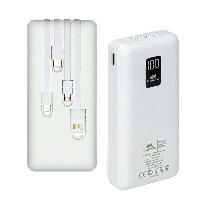 VA2220 WhitePortable rechargeable battery with built-in cablesProduct Features:• 20000 mAh rechargeable Li-Pol battery.• Display shows the level of charge.• Protection from over-charging, over-discharging, overload and short circuit.• Automatic turn on/off. Just plug your device(s) into RIVACASE battery output socket(s) and the charging will start.• Smartphone charging - up to 5 times.KEY FEATURE:• 4 built-in cables - no need to search for the right cable to charge your phone!• Digital Display• Pass-through charging