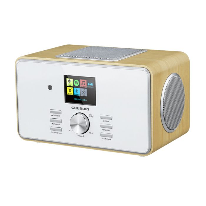 DTR 6000 X hrast Digitalni radio Grundig Multiroom sustav omogućava sinkroniziranu reprodukciju pjesama s 5 uređaja Internet, Bluetooth, multiroom i DAB+ 2.1 stereo sustav zvučnika (2 x 4W) i integrirani subwoofer (20W) Bluetooth audio prijenos USB priključak Funkcije alarma, stanja mirovanja i odgode AUX ulaz Dimenzije (širina x visina x dubina): 23,5 x 12,8 x 13,5 cm