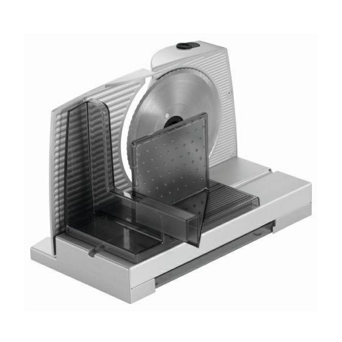 Snaga: 65 W Motor: ECO, 20% manja potrošnja i 50% veća učinkovitost Oštrica: Solingen, promjera 17 cm Podesiva širina rezanja do 20 mm, duljina rezanja cca. 18 cm, opteretni radni ciklus cca. 5 minuta Metalno kućište, PVC zaštita noževa, PVC držač hrane, PVC posuda za hranu Pohrana kabela, sigurnosni gumb za povremeni ili kontinuirani rad Dimenzije: 20,5 x 23 x 33 cm Težina: 2,6 kg Boja: nehrđajući čelik/siva