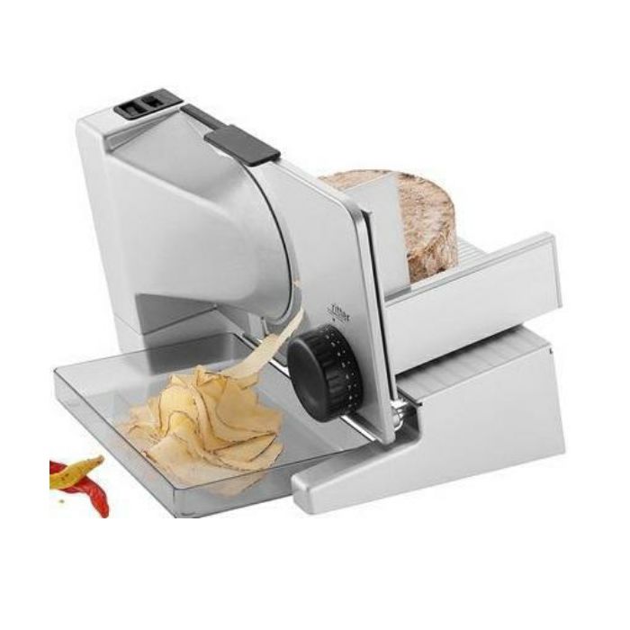 Snaga: 130 W Motor: DC Oštrica: Solingen, promjera 17 cm Podesiva širina rezanja do 23 mm, duljina rezanja cca. 24 cm, opteretni radni ciklus cca. 10 minuta Metalno kućište, zaštita i poklopac noževa, PVC držač hrane, PVC posuda za hranu Elektroničko podešavanje brzine, pohrana kabela, sigurnosni gumb za povremeni ili kontinuirani rad Dimenzije: 30 x 24,5 x 37 cm Težina: 5,3 kg Boja: nehrđajući čelik/siva