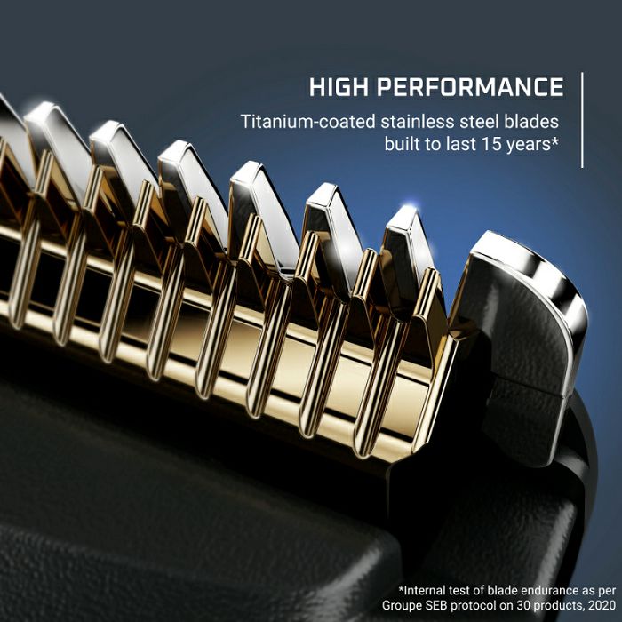 Trimer za kosu i bradu s oštricama od nehrđajućeg čelika obloženim titanom dizajniran za 15 godina rada [unutarnji test izdržljivosti oštrice prema Groupe SEB protokolu na 30 proizvoda, 2020.]