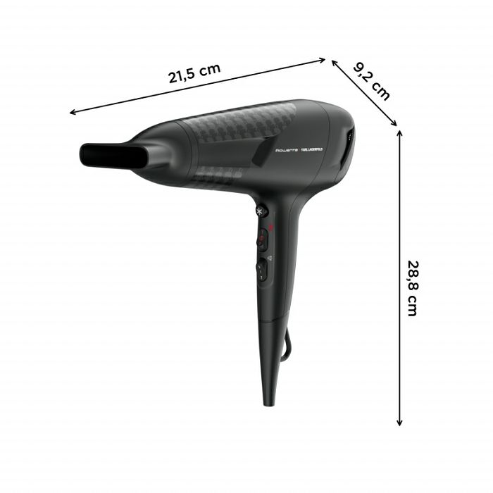 Sušilnik las Studio DRY ROWENTA x KARL LAGERFELD 2300 EffiWatts 2 hitrosti / 3 temperature Udar hladnega zraka 12 mm koncentrator Hitro sušenje 1.8 m dolžina el. vrvice Končni učinek svetlečih las ECO energy