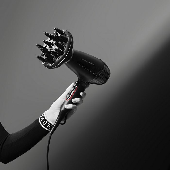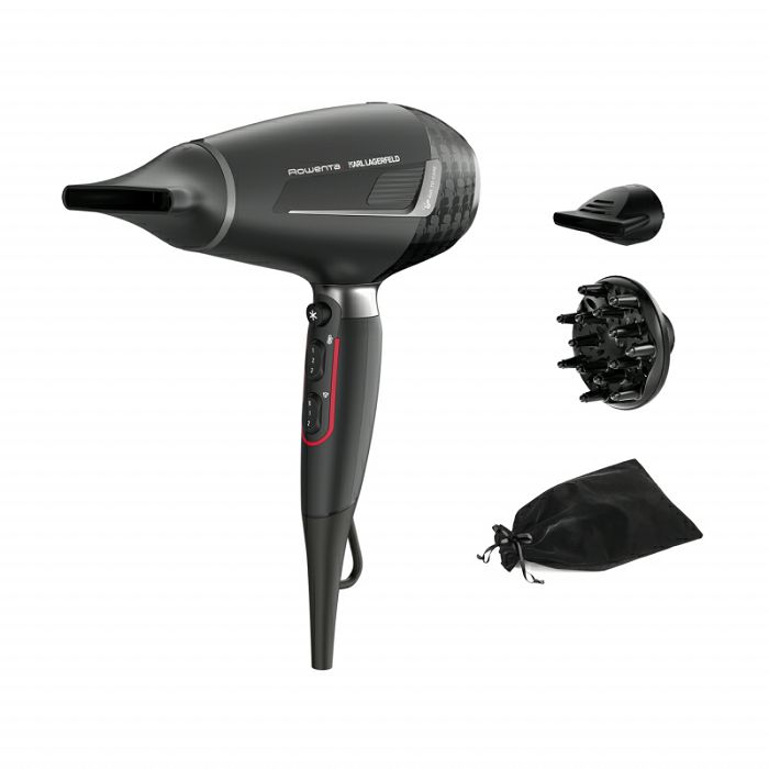 Sušilnik las ROWENTA x KARL LAGERFELD Pro 2200W AC motor Ionic sistem 2 hitrosti / 3 temperature Udar hladnega zraka Keratin & Glow obloga 6 mm koncentrator za ravno sušenje las 9 mm koncentrator za valovito sušenje las Difuzor 1.8 m dolžina el. vrvice Končni učinek svetlečih las Dodatek - žametna torbica za shranjevanje sušilnika