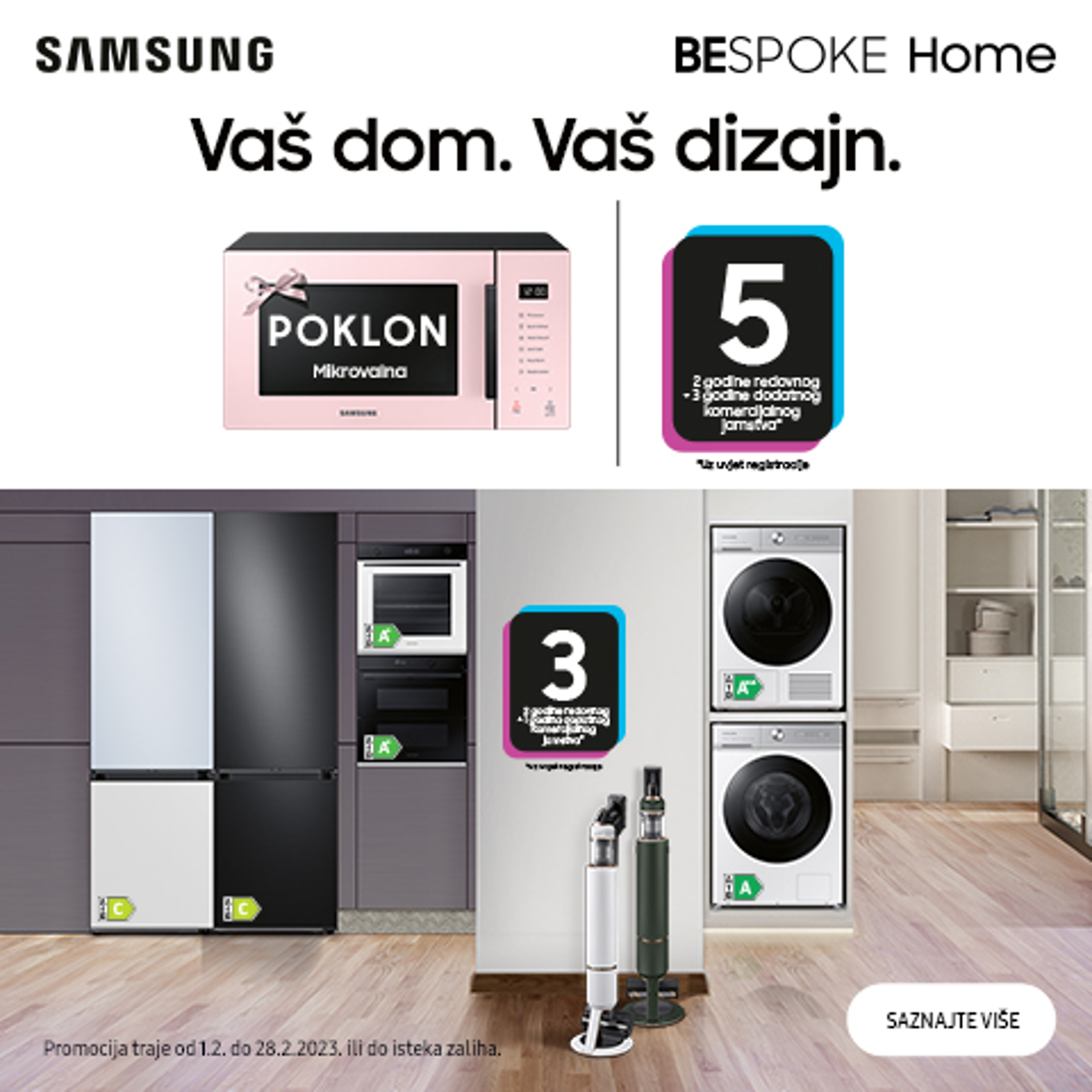 5 godina jamstva* (2 godine redovnog + 3 godine dodatnog komercijalnog jamstva) na kupnju odabranih Bespoke Home kućanskih uređaja i 3 godine jamstva* na Bespoke Jet usisavače (2 godine redovnog + 1 godina dodatnog komercijalnog jamstva).