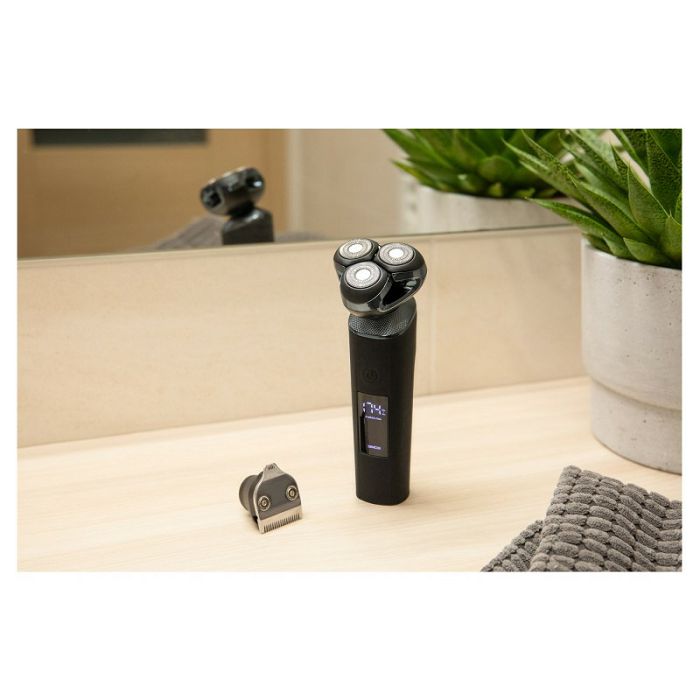 Tehnologija izravnog pogona omogućuje napajanje izravno iz električne utičnice tijekom punjenja- Uređaj se napaja iz baterije- Uređaj se napaja iz utičnice dok se puni- Uređaj se napaja izravno iz utičnice dok se puni, stoga nije potrebno čekati da se baterija do kraja napuni.Izvanredno tihi profesionalni motor visoke brzine osigurava udobno brijanje brade i brkova Jedinstvena samočisteća glavaNamijenjen za suho brijanjeOštrice od nehrđajućeg čelikaŠišač obložen titanijemErgonomska drška sprječava klizanje u ruciMože se potpuno prati u tekućoj vodiLED zaslon prikazuje napunjenost baterijeVrijeme rada na bateriji do 3 sataTehnologija brzog punjenja omogućuje potpuno punjenje za 3,5 satiPrekidač za UKLJUČIVANJE/ISKLJUČIVANJEFunkcija sigurnosnog zaključavanja sprječava nehotično uključivanjeUgrađena Li-ionska baterija kapaciteta 2500 mAhPriloženi dodaci: - Četkica za čišćenje- Šišač za kosu- USB kabel za punjenje- USB adapter za punjenjeDužina kabela napajanja: 170 cmMasa: 210 gDimenzije (visina x dubina x širina): 170 × 66 × 59 mm