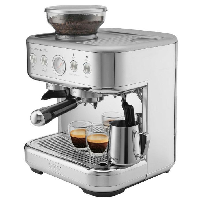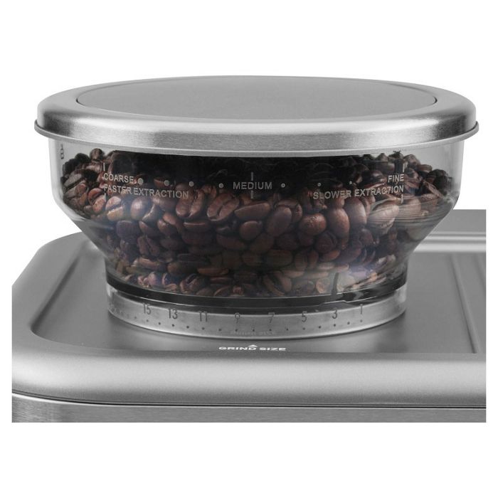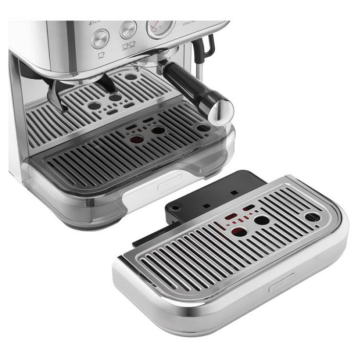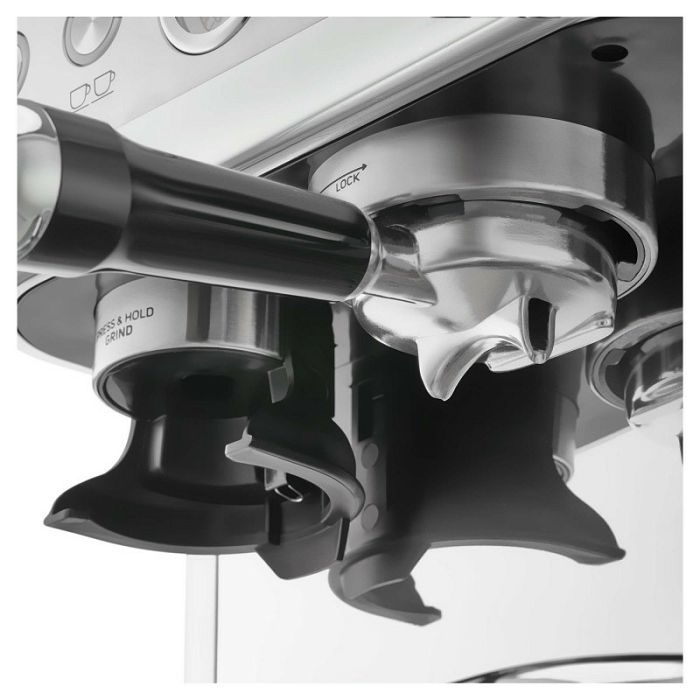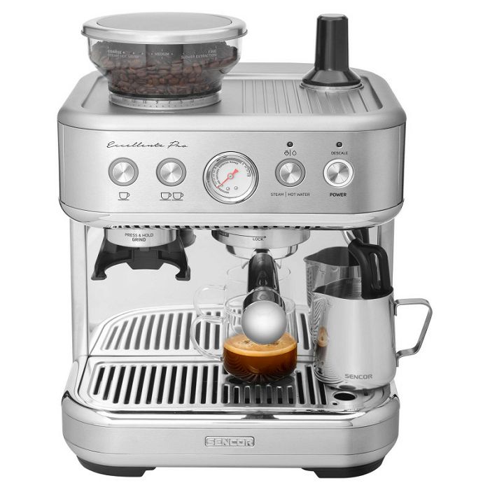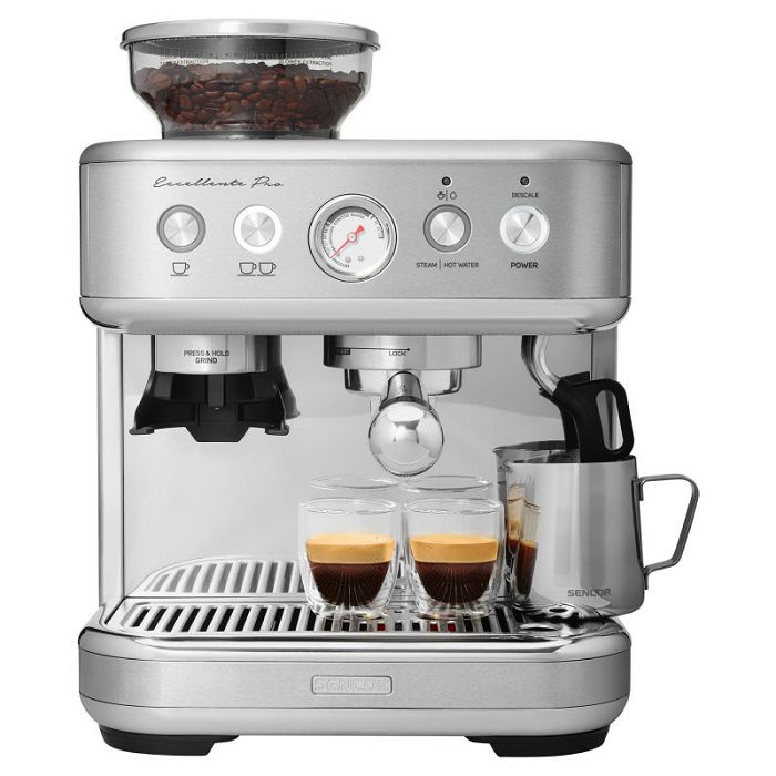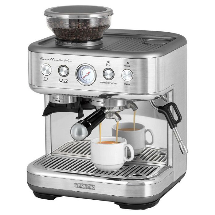 GLAVNE PREDNOSTI Integrirana stožasta brusilica s metalnim brusnim kamenjem Tlačna pumpa 15 bara Sustav grijanja kotla s termoblokom Indikator tlaka ekstrakcije kave FUNKCIJE I SVOJSTVA 15 postavki grubosti mljevenja kave Automatski senzor brušenja 3 automatska programa(Espresso, 2x Espresso, parna / topla voda)Funkcija prije kuhanja Okretni štapić za paru Nehrđajući čelični štapić Filtar od nehrđajućeg čelika za 1 i 2 šalice Pare / tople vode Odabir Velika ploča za zagrijavanje čaša s prostorom za skladištenje Posude za mlijeko od nehrđajućeg čelika Professional 58 mm poluga od nehrđajućeg čelika / portafilterOdvojivi ladica za kapanjeIzuzetno velika visina šalice idealna za šalice za kavuSpremnik za 250 g zrna kave Spremnik za vodu 2,3 l (indikator volumena vode)Indikatorsko svjetlo za potrebu uklanjanja kamenca uređajON/OFF Prekidač s indikatorskim svjetlomDizajnerski uređaj od nehrđajućeg čelika PRIBOR Držač filtra Mjerna lopatica2 filtra (za 1 i 2 šalice)Posuda za mlijeko Komplet za čišćenje Tamper
