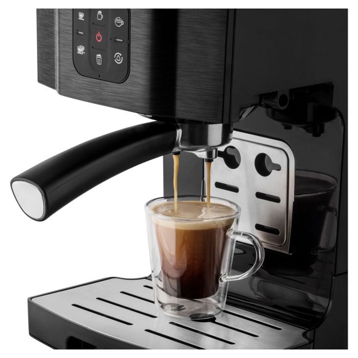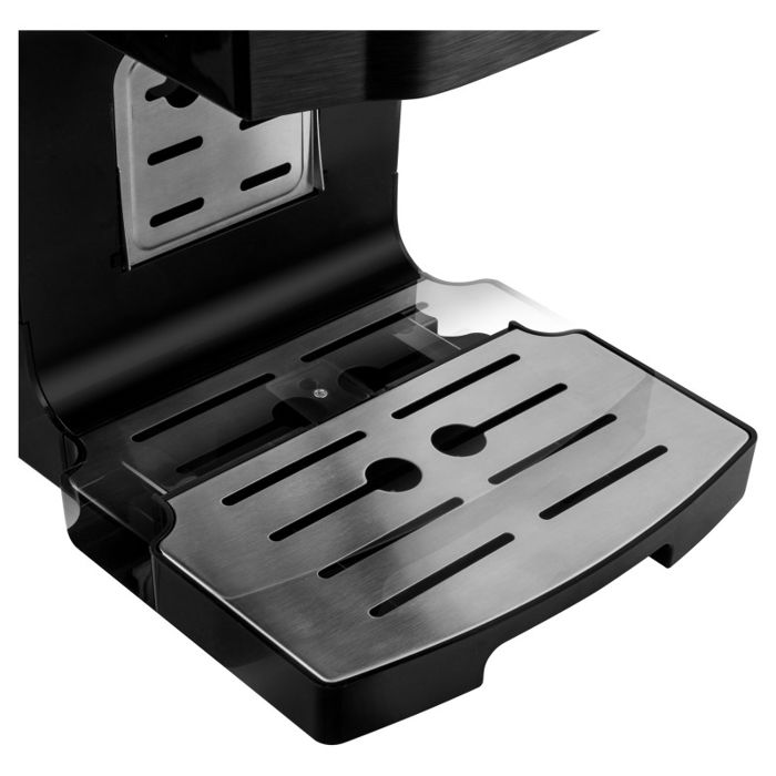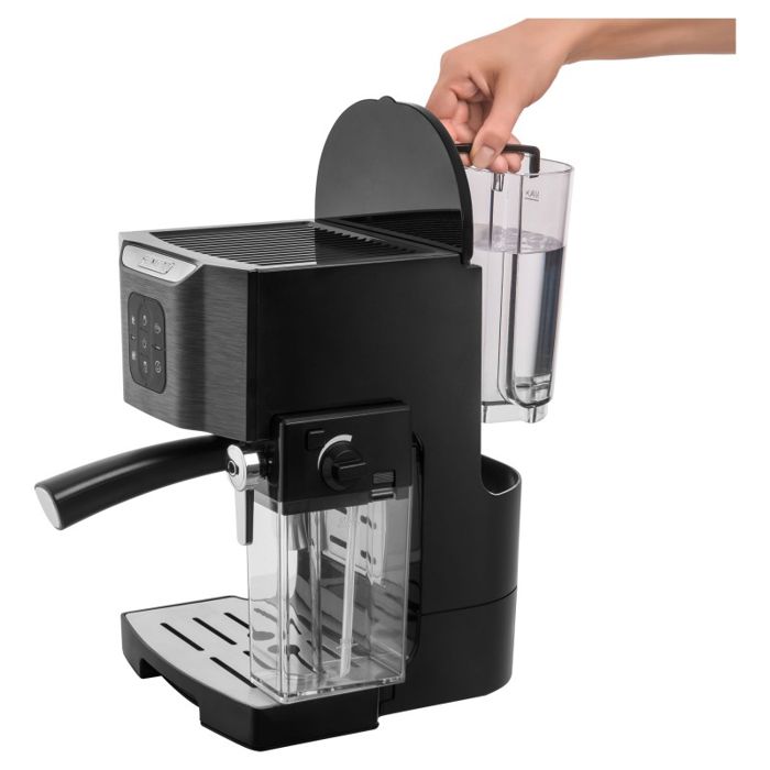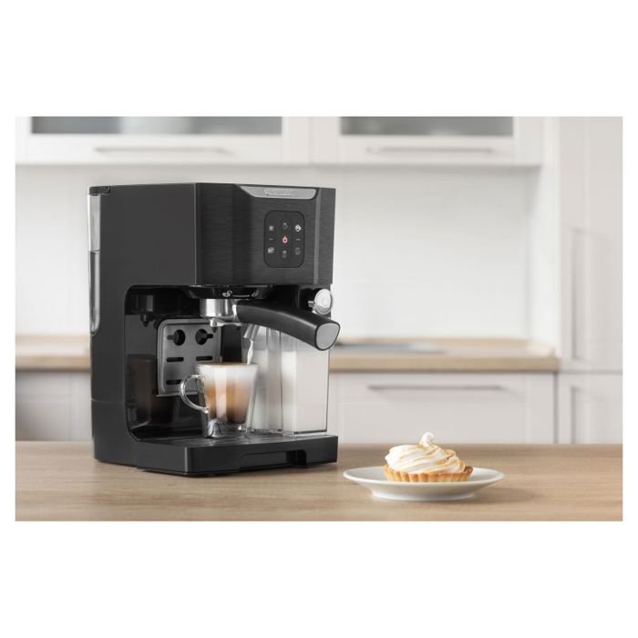 20 Bar pumpa za savršenu kavu Sustav grijanja bojlera s termoblokom Super brzo predgrijavanje Sustav za intenzivni okus Espresso s jednim dodirom, dvostruki espresso, program za kapučino, Latté. Prozirna posuda za mlijeko s odvojivim uređajem za pjenjenje mlijeka za jednostavno čišćenje Filter od nehrđajućeg čelika za 1 i 2 šalice Toplija ploča za šalice Funkcija memorije veličine kave Elektronski kontroler PCB-a kako bi se osigurala točnija temperatura pića Poklopac od nehrđajućeg čelika za espresso kavu Automatska funkcija samočišćenja Odvojivi pladanj za jednostavno čišćenje Visoka visina kupa idealna je za šalice za kavu Prenosivi 1,4-litarski spremnik za vodu uvijek osigurava svježu vodu za vašu ukusnu kavu Indikator volumena vode Pokazatelj uklanjanja kamenca Program za uklanjanje kamenca Prekidač ON / OFF s indikatorskim svjetlom Anti-slip Feet Dodatna oprema: Držač filtra, mjerni oblog, 2 filtra (za 1 i 2 čaše) Ulazna snaga: 1,450W Razina buke maks. 70dB Duljina kabela za napajanje: 95cm Dimenzije (širina × dubina × visina): 309 × 229 × 355 mm Težina: 4.3kg Napon i frekvencija: 220–240V, 50Hz
