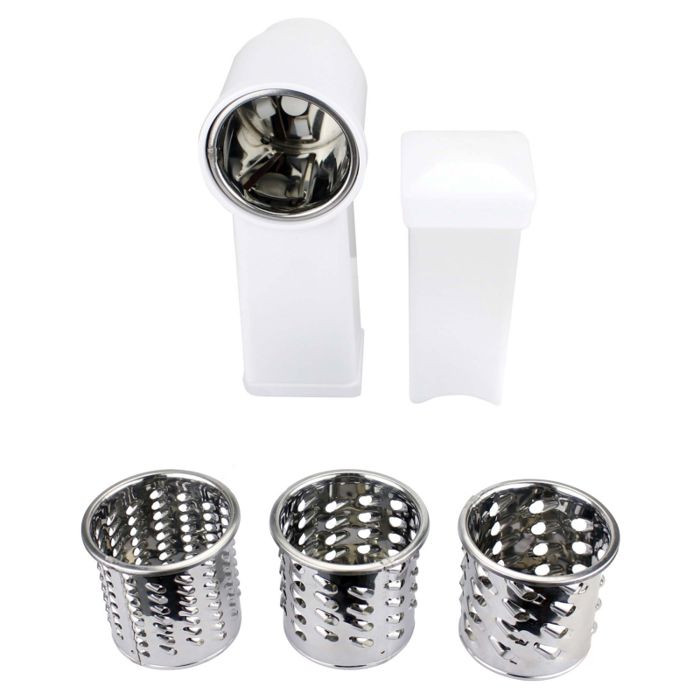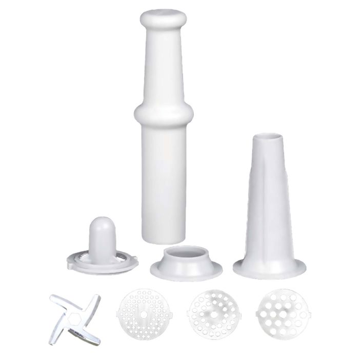 Motor od 500 W/ Maks. snaga 1400 W Brzo i lako mljevenje raznih vrsta mesa Kapacitet: 100 kg/h 3 diska za mljevenje ekstra fino 3 mm/ fino 5 mm/ grubo 7 mm Oštrica i diskovi za mljevenje izrađeni od trajnog čelika Plastična tava za punjenje Gurač hrane Nastavak za kobasice i ćufte Sjeckalica i ribež: Tanko sjeckanje Grubo usitnjavanje / ribanje Fino usitnjavanje / ribanje Ribež za tvrdi sir i orašaste plodove Protuklizne nožice
