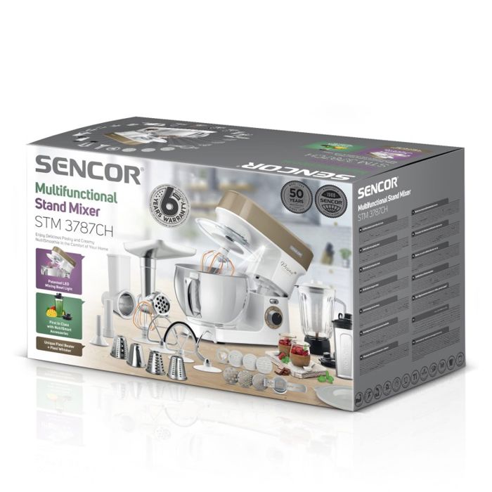 PROCESOR HRANE SENCOR Izvanredno snažan motor od 1200 W za savršene rezultate Iznimno velika posuda od 5 l od nehrđajućeg čelika za sve vrste tijesta (0,8 kg teškog tijesta, 2,2 l laganog tijesta) 6 postavki brzine + funkcija PULS + 2 programa NutriSmart za sve zadatke MIKSER 4 napredna nastavka za miješenje i mućenje Poseban FLEXI nastavak za tučenje i FLEXI mutilica za lagana tijestaJedinstveni magnetski poklopci daju veću praktičnost MIJEŠALICA ZA HRANU Staklenka od 1,5 l Oštrice obložene titanijemNutri usitnjavačPribor NutriBlender s udobnom čašom za pijenje Oštrice obložene titanijem2 jedinstvena programa za usitnjavanje MLINAC ZA MESO grubo i fino mljevenje s nastavcima za punjenje kobasica 3 alata za izradu rezanaca Nastavak za kekse SJECKALICA I USITNJAVAČ 4 nastavka od nehrđajućeg čelika:- Valovito (izbrazdano) sjeckanje- Grubo usitnjavanje / ribanje- Fino usitnjavanje / ribanje- Ribež za tvrdi sir i orašaste plodove