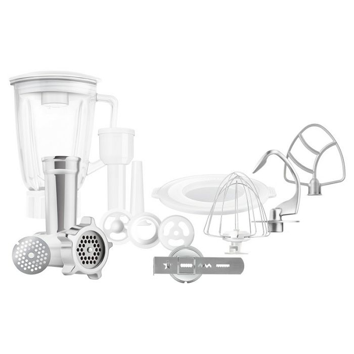 PROCESOR HRANE SENCOR Snažan motor od 1 000 W s jamstvom 6 godina Robusno tijelo u cijelosti od metala i s metalnim zupčanicima Dizajn s 3 glavčine Sencor pametna snaga i energija - za optimalnu brzinu Regulator brzine s blagim započinjanjem i 8 razina brzine Impulsna funkcija LED rasvjeta posude za sjeckanje Posuda od nehrđajućeg čelika veličine 4,5 litara i mjernom ljestvicom Proziran poklopac posude s dovodnom cijevi za jednostavno dodavanja sastojaka tijekom sjeckanja Plastičan poklopac za skladištenje posude od nehrđajućeg čelika Planetarni sustav miješanje, sjeckanja i tučenja - osigurava potpunu nasjeckanost cjelokupnog sadržaja posude - nastavci simultano rotiraju oko svojih vlastitih osi, kao i oko osi motora - omogućuje obradu 100% sadržaj posude, jamči savršeno sjeckanje sastojaka Bajunetni sustav postavljanja nastavaka omogućuje brzo sklapanja i zamjenu Osiguravajuća blokada u gornjem položaju nagibnog kraka Staklena posuda za sjeckanje veličine 1,5 litara Aparat za mljevenje mesa za fino i grubo mljevenje 3 nastavka za miješanje, sjeckanje i tučenje - oštrica za miješanje, mlatilica A-profila, pjenjača za tučenje Specijalna FLEXI mlatilica za miješanje, pogodna za fina tijesta Punilica kobasica s 2 promjera Izrađivač kolača Tuče do 8 bjelanjaka