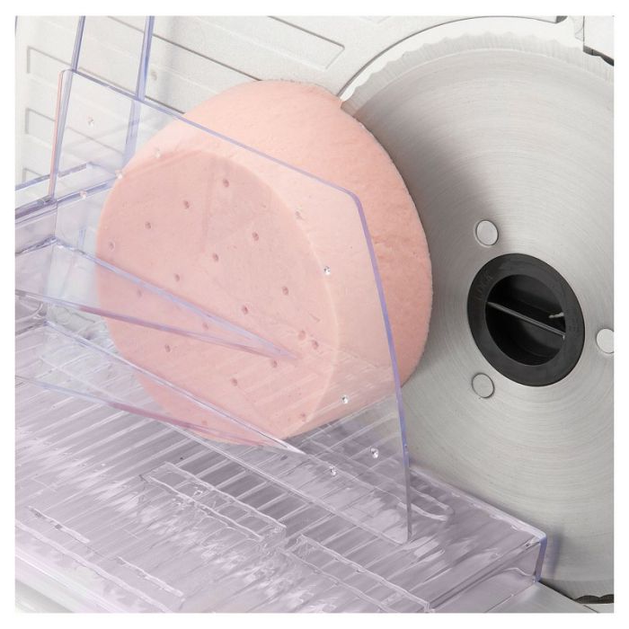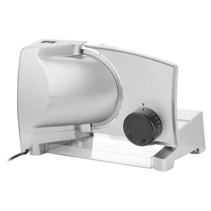 Odvojivi disk za rezanje od nehrđajućeg čelika (promjer 170 mm)Okretni gumb za besprijekorno podesivu širinu rezanja (0-23 mm)Odvojivi hod s zaustavljanjem u oba smjeraUlagač pritiska s hvatačima protiv nenamjernog pomicanja hrane tijekom rezanjaIzmjenjivi dijelovi za lako čišćenje i pranje Potrošnja energije 100 W, 220-240 V
