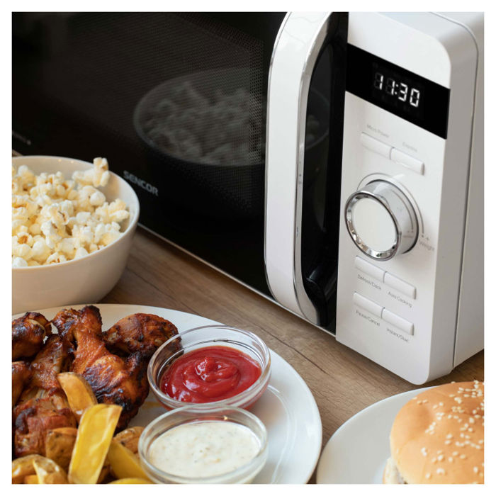 Predstavljamo mikrovalnu pećnicu SMW 5017WH, koja ima volumen od 17 l i može se pohvaliti izvrsnom mikrovalnom snagom od 800 W. Imam sjajne značajke koje jednostavno pripadaju visokokvalitetnoj mikrovalnoj pećnici, pa čak i nešto više. Isprobajte me! Sencor mi je pružio jednostavan rad, LED ploču i osam automatskih programa. Nadopunite svoju kuhinju snažnom mikrovalnom pećnicom i odaberite između tri suptilne boje. IMAM 8 AUTOMATSKIH PROGRAMA I ZNAČAJKU ODGOĐENOG POKRETANJA Više ne morate razmišljati o tome koje vrijeme ili snagu trebate odabrati za pravo grijanje. Ja sam mikrovalna pećnica koja automatski postavlja sve te vrijednosti. Izuzetno sam sposoban i pouzdan! Kroz LED ploču i sat možete gledati cijeli moj proces i postaviti programe i funkcije s okretnim gumbom. Imam 5 razina snage mikrovalne pećnice, 3 načina odmrzavanja i 8 automatskih programa za mnoge delicije poput kokica. Pa, ako dodam početak kašnjenja i funkciju tajmera na 60 minuta, imate jasan izbor. Otkrijte prednosti Sencorove mikrovalne pećnice SMW 5017WH. IMAM NISKU RAZINU BUKE, SAMO 65 DB (A) Rado ćete se oprostiti od svoje stare mikrovalne pećnice. Sencor me napravio s niskom razinom buke, s maksimalnom snagom od samo 65 dB (A). Nećete ni primijetiti moj rad, a kad grijanje završi, bit ćete upozoreni zvučnim signalom. Tihi rad i pametne funkcije čine me super mikrovalnom pećnicom za brzo i duže zagrijavanje. Vjeruj mi, brzo ćeš se naviknuti na mene! GLAVNE PREDNOSTI LED ploča s 8 jednostavnih programa Mikrovalno grijanje za jednostavno i brzo podgrijavanje i kuhanje Izdržljiva unutrašnjost cakline za jednostavno čišćenje FUNKCIJE I SVOJSTVA Veliki unutarnji prostor: Kompatibilan s još većim pločama volumena do 27 cm 17 l5 Razina snage mikrovalne pećnice kako bi se zadovoljila svaka potrebafunkcija odmrzavanja za brzo i higijensko odmrzavanje60-minutni mjerač vremena Dovoljan i za kuhanjemikrovalna pećnica 800 WZvučni signal za označavanje dimenzija kraja programa(š x h x d): 451 x 256 x 354 mm