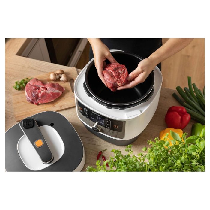 Više ne morate trošiti puno vremena u kuhinji kuhajući i pripremajući sastojke. Sa mnom možete provoditi više vremena sa svojom obitelji ili sami sa aktivnostima koje volite. Ja sam električni multifunkcijski štednjak s pritiskom iz Sencora, koji u svim smjerovima poduzima radnju električnih, plinskih štednjaka i pećnice, a ja sam za 50% brži i učinkovitiji od njih. Uštedjet ću puno vremena uz minimalnu potrošnju energije. Ne morate se više brinuti pripremiti ručkove i večere za cijelu obitelj, glomazan sam i mogu pripremiti ukusna jela za do sedam osoba. Sa mnom ćete otkriti prednosti kuhanja pod pritiskom koje si ne možete priuštiti! SA 14 UNAPRIJED PROGRAMIRANIH PROGRAMA MOGU SE NOSITI S BILO KOJOM TERMIČKOM OBRADOM. Kuham polako i klasično, pržim, pečem, pečem, parim, itd. Mogu se nositi sa svim toplinskim tretmanima gotovo bilo gdje, zahvaljujući mogućnosti ožičenja gdje god vidite ladicu. Nudim 14 pametnih programa u kojima imam unaprijed postavljenu temperaturu, vrijeme i optimalan tlak. Kuham ukusno, zdravo s minimalnom količinom vode, pa čak i bez dodanog ulja! Jela su sočna, puna okusa, mirisa i svih hranjivih sastojaka. Mogu napraviti bezbroj recepata, samo odabrati jedan od programa i to je to! PODESITE TEMPERATURU I VRIJEME PREMA VAŠIM ŽELJAMA. Možete ručno podesiti temperaturu, vrijeme i razinu tlaka, iako mogu raditi automatski s unaprijed postavljenim programima. Prilikom odabira načina jakog, standardnog i laganog svjetla, polako možete prilagoditi dubinu tlaka prema vlastitim željama. IMAM LAKU I JASNU KONTROLU. Ništa od ovoga ne bi bilo moguće bez moje upravljačke ploče koja je savršeno prilagođena za brzo i jednostavno rukovanje u samo nekoliko koraka. Pomoću okretnog gumba možete intuitivno odabrati unaprijed postavljene programe. Svaki program ima svoju LED ikonu slike i uključivanjem regulatora svijetli pojedinačni program. Sve ostale funkcije, temperaturu i vrijeme, možete podesiti LED zaslon, gdje prikazujem sve trenutne podatke o svojim aktivnostima, tako da vi i ja imamo pregled! MOGU KUHATI BEZ VAŠE PRISUTNOSTI. Za većinu mojih programa ne treba mi nikakva pažnja ili vaša prisutnost. Kuham čak i kad ste na poslu ili idete van i želite večeru ili ručak za obitelj kod kuće. Odabirom programa i odgođenim startom ispeći ću super kolač, skuhati umak ili izvrsnu juhu. Kad stignem kući čekat ću s spremnom, ukusnom i mirisnom hranom. Pomoću funkcije Keep Warm hranu automatski držim toplu do osam sati, tako da je možete poslužiti pravo na tanjuru! SENCOR JE STVORIO NIZ KORISNIH DODATAKA PRILAGOĐENIH MENI. U mom paketu naći ćete sve potrebne alate! Skladište ih treba osigurati u bilo kojem loncu, koji također može kampirati ili kuhati na mjestima gdje nema štednjaka zahvaljujući električnom priključku. Zahvaljujući mojim dodacima, možete udobno pariti knedle, miješati hranu, izmjeriti dozu riže ili mahunarki i dobiti spremnu hranu. Ne morate brinuti zbog kompliciranog pranja! Uklonjivi lonac ima visokokvalitetnu površinu protiv ljepljenja koja se lako pere vodom, a pribor za kuhanje može se prati u perilici posuđa. IZUZETNO SAM SIGURAN! · Ja pratim visoke temperature da ne bih spalio hranu · Unutarnji osjetnik temperature automatski podešava intenzitet grijanja · Poklopac štiti od kamenca i jamči sigurno otvaranje · Poklopac ventila za regulaciju pritiska sprječava da se hrana lijepi · Uz pouzdani tajmer, automatski se isključuje nakon odbrojavanja · Poklopac ima pametno zaključavanje koje omogućuje aktiviranje samo kad je zaključano · Moj poklopac je praktičan s termički izoliranom ručicom i izvrsnim brtvljenjem · Sigurnosni ventil za plovku sprječava otvaranje lonca kada u njemu postoji pritisak · Inteligentno pratim stanje unutarnjeg pritiska · Sama održavam siguran pritisak · Ja automatski oslobađam visoki tlak · Dopuštam ručno oslobađanje tlaka iz tlačnog ventila · Garantiram veliku stabilnost MOJE GLAVNE PREDNOSTI · Omogućuje višenamjensku toplinsku obradu s 14 programa · Skraćuje postupak kuhanja za više od polovice · Uključeni su praktični pribor KUHANJE POD VISOKIM PRITISKOM · skraćuje postupak kuhanja za više od polovice · omogućuje kuhanje mahunarki (grah, slanutak itd.) bez namakanja · čuva okus i miris kuhane hrane · štedi energiju kuhanja · omogućuje vam pripremu zdravijih obroka AUTOMATSKO KUHANJE S 14 UNAPRIJED PROGRAMIRANIH PROGRAMA Programi imaju unaprijed postavljeno vrijeme kuhanja, temperaturu i razinu tlaka za rezultate bez napora.Za većinu unaprijed programiranih programa možete slobodno mijenjati vrijeme i temperaturu kuhanja. · prženje · gušenje · meso · riba · Sporo kuhanje · jogurt · deserti · riža · kruh · tjestenina · povrće · pečenje · pite · Kuhanje na pari LONAC IMA NAJBOLJU SIGURNOSNU ZAŠTITU · Prati temperaturu kako bi se spriječilo sagorijevanje hrane · Osjeti unutarnju temperaturu i prilagođava intenzitet grijanja · Poklopac posude štiti od kamenca i jamči sigurno otvaranje · Poklopac ventila za regulaciju pritiska sprječava da se hrana zalijepi kako bi se spriječilo zaglavljivanje · Pouzdan tajmer koji se automatski isključuje nakon odbrojavanja · Poklopac lonca ima pametan sustav zaključavanja koji mu omogućuje spuštanje samo kad je zaključan · Poklopac posude pod tlakom je praktičan s termički izoliranom ručkom i izvrsnim brtvilom · Sigurnosni ventil za plovku sprječava otvaranje lonca kada postoji pritisak · Lonac inteligentno nadgleda stanje unutarnjeg tlaka i, ako taj pritisak nije normalan, pokreće upozorenje · Lonac automatski održava sigurnu vrijednost tlaka · Kad štednjak dosegne granicu tlaka, automatski će otpustiti paru iz privremenih otvora · Lonac omogućuje sigurno uklanjanje tlaka s ventila za smanjenje tlaka · Lonac jamči izvrsnu stabilnost FUNKCIJE I ZNAČAJKE Unutarnji spremnik nonstick volumena 5,5 litaraljepljive površin