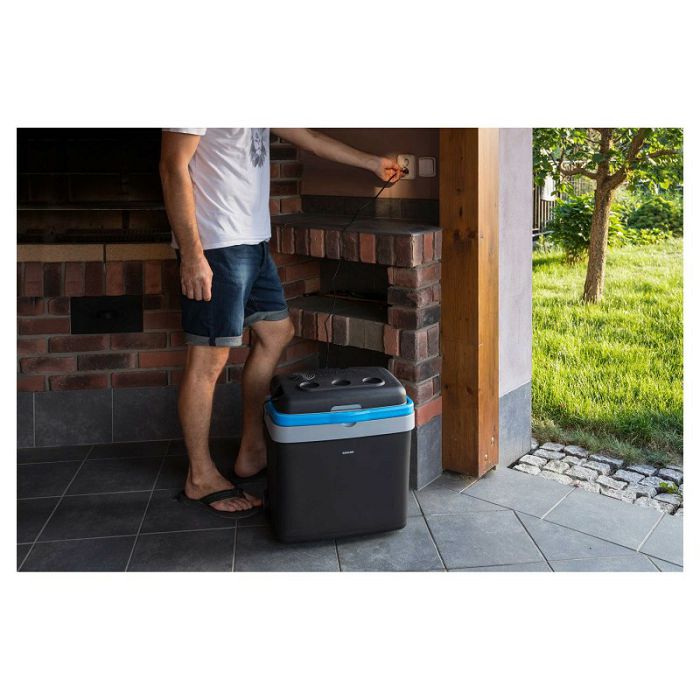 Suvremen dizajn s kapacitetom od 33 litre Jaka sklopiva ručka i veliki kotači Mogućnost hlađenja i grijanja Zeleno/crveno LED svjetlo signalizira hlađenje ili grijanjeZa upotrebu u automobilu i kućanstvu (dvostruko napajanje 12/230 V)Odvojiva razdjelna rešetka za praktično raspoređivanje sadržaja Velika ručka za lako nošenjePriključak na utičnicu od 12 V (automobilski upaljač) / utičnicu mrežnog napajanja od 230 VNačin rada ECO kada se napaja s 230 V (hlađenje će prestati kada se dostigne 12 °C)Prostor za devet PET boca od 1,5 litara ili pet PET boca od 2 litre, kada je poklopac zatvorenHladi do 16-18 °C ispod okolne temperatureOdvojivi poklopac DVOSTRUKI ZAŠTITNI SUSTAV ZATVARANJA poklopac se može otvoriti samo ako je ručka zaklopljena plastična blokada na gornjem poklopcu, otvoreni poklopac ne može pasti i ozlijediti nečije ruke Ventilacijski sustav s dugotrajnim motorom bez četkicaKvalitetna izolacijaUlazna snaga 60 WDužina kabela napajanja za 12 V: 2 mDužina kabela napajanja za 230 V: 1,8 mMasa: 7 kg