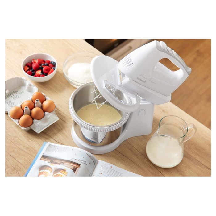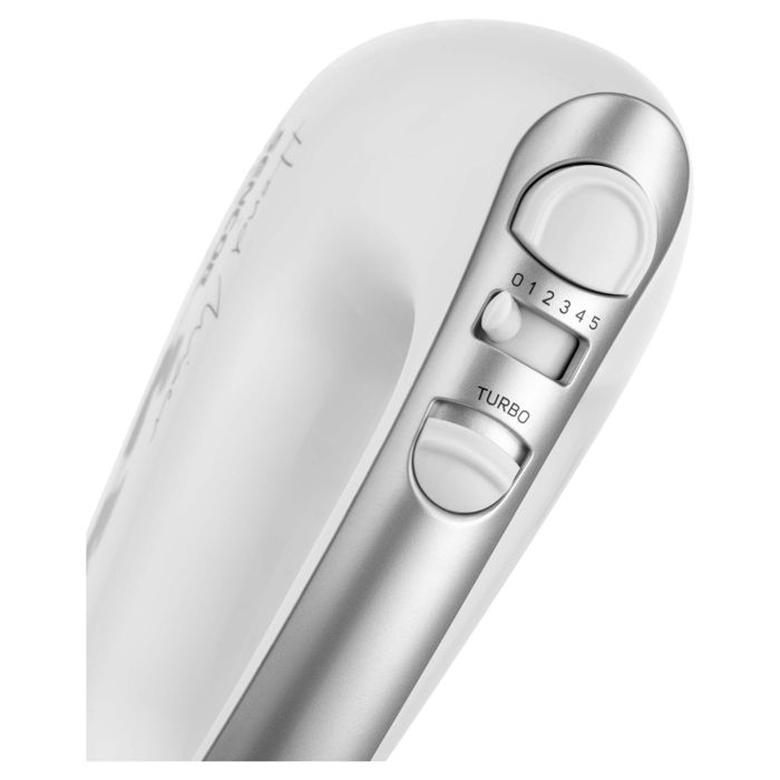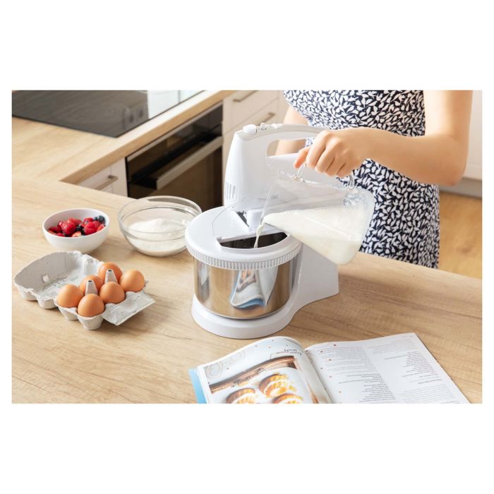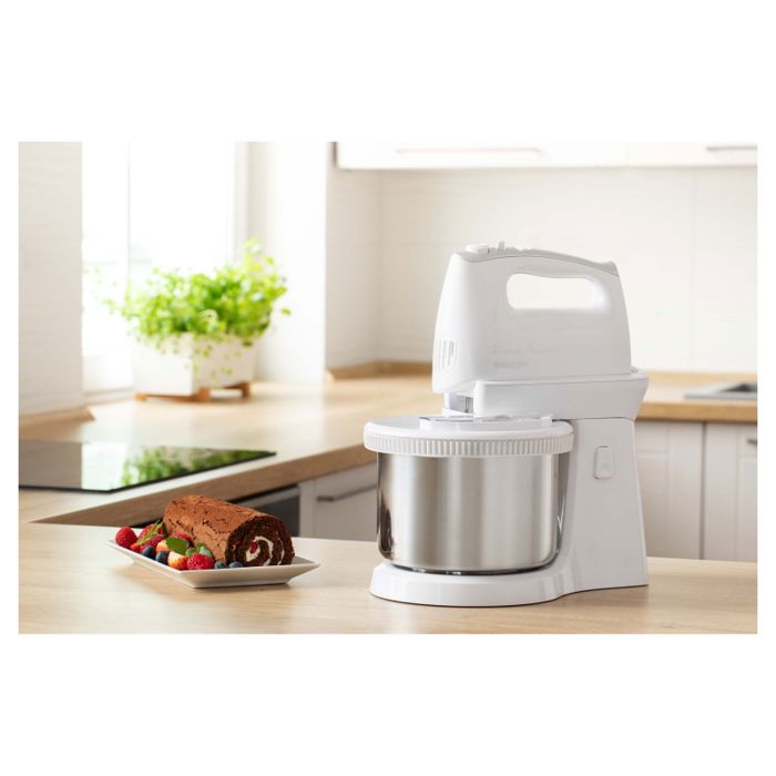 RUČNI MIKSER S ROTIRAJUĆOM ZDJELOM 5 razina brzine za sve vrste recepata Turbo tipka za maksimalnu brzinu 2 vrste privitaka: Set od 2 kom kromiranog čeličnog pribora za šlag, vrhnje, pire krumpir, namaze, bjelanjke i žumanjke Set od 2 kom kromiranih kuka za gnječenje tijesta Gumb za ugodno otpuštanje i uklanjanje priključakaTihi radErgonomski dizajnToplinski osigurač protiv pregrijavanjaUlaz snage 500 WMaksimalna zapremina rotirajuće posude od nehrđajućeg čelika je 2,5 LDuljina kabela za napajanje: 1,2 m