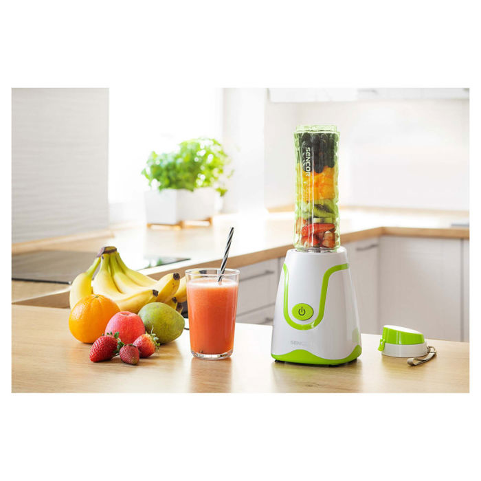 •Idealno za pripremu svježih voćnih i fitness napitaka, milkshakeova, miješanih napitaka, koktela, juha, salsa, umaka, dječje hrane• Boca za miješanje može se ukloniti i koristiti kao putna boca• Poklopac s izljevom za piće sprječava slučajno izlijevanje• Lako se čisti: Boca, poklopac i oštrice su sigurnaza perilicu posuđa• Jedna 0,6-litrena uklonjiva boca otporna na udarce izrađena od PCTG materijala (bez BPA)• Pulsni prekidač za učinkovito miješanje• Visokokvalitetne uklonjive četiri oštrice od nehrđajućeg čelika s premazom od titana - Sprječavanje gubitka enzima i vitamina - Smanjenje oksidacije smoothiejaNutrija• Izvanredna stabilnost zahvaljujući usisnim čašama• Boce pogodne za držaččaše za automobil• Ulaz snage: 500 W• Napon i frekvencija: 220-240 V, 50/60 Hz• TRITAN lopatice
