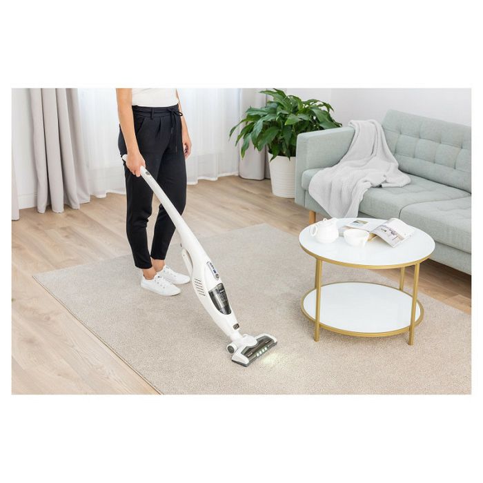 BEŽIČNI USISAVAČ 2 U 1 2-u-1 bežični štapni usisavač s uklonjivom ručnom jedinicom Apsolutna sloboda kretanja bez kabela za napajanje Lagan, tih i jednostavan za upravljanje usisavač nudi brzo i jednostavno rješenje za svakodnevno čišćenje svih vrsta površina. Odvojiva ručna jedinica za ugodno uklanjanje prljavštine i prašine s namještaja, stolova ili čišćenja automobila.Vrlo snažna Li-Ion baterija od 11,1 V s kratkim vremenom punjenja i dugim radnim vremenom: Vrijeme punjenja 4,5 sati Vrijeme rada do 25 minuta HEPA sustavza filtriranje ciklona Rotacijska četka s neovisnim motorom osigurava izvanredne rezultate na bilo kojoj vrsti poda i poboljšava usisavanje prljavštine s tepihaMlaznica s LED rasvjetom lako izlaže i najfiniju prašinu i pojednostavljuje usisavanje tamnijih mjestaSamostojeća funkcija za privremeno postavljanje i udobno skladištenjeIzvrsna kontrola i jednostavna upravljivost oko namještaja zahvaljujući okretnoj vakuumskoj mlaznici u radijusu od 180 ° i maloj težini usisavačaErgonomska ručkaLed indikatorsnage baterije 2-stupanjski rad: velika snaga, produženo vrijemeusisavanja Isporučeni pribor: mlaznica za pukotine i četkaza prašinu Tehnologija bez vrećica, volumen spremnika za prašinu: 0,5lJednostavan sustav rastavljanja za jednostavno pražnjenje spremnika za prašinu i čišćenje filteraTip baterije: Li-Ion 2.200 mAhNapon napajanja: 11,1 VRazina buke: 76 dBDimenzije: širina: 286 mm mm, visina: 1 135 mm, dubina: 236 mmTežina: 2,8 kg