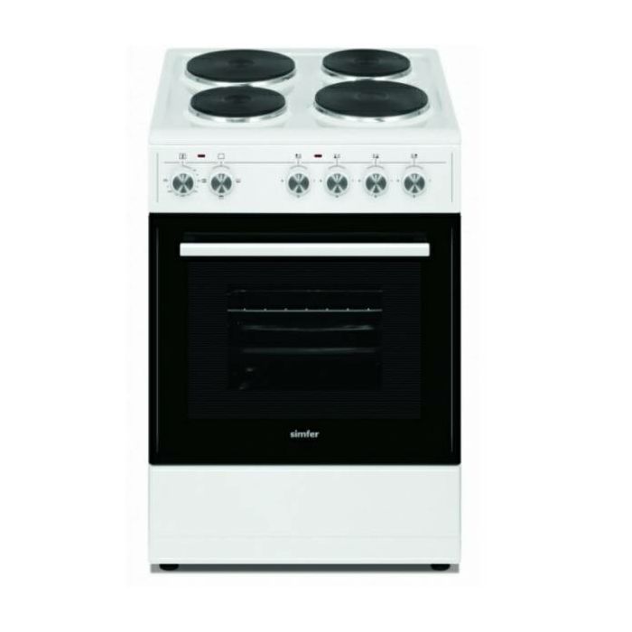 Samostojeći električni štednjak Simfer 4043 SERBB širine 50 cm ima 4 električne ploče za kuhanje dimenzija 2 x 14,5 cm i 2 x 18 cm te pećnicu od 48 litara s 3 programa pečenja, duplim vratima, 1 tepsijom i mrežicom roštilj. Električno kuhalo prostor za kuhanje - 4 električne ploče 2x Ø14,5 cm 2x Ø18 cm 3 funkcije pečenja konvencionalna električna pećnica dvostruko staklo na vratima pećnice osvjetljenje pećnice 1 tepsija bijela boja bez pokrića zapremnina pećnice: 54 l energetski razred: A dimenzije: 50x50x85 cm