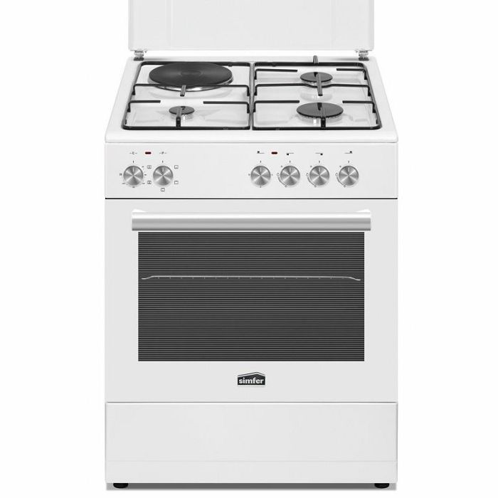 Samostojeći kombinirani štednjak Simfer 6315 SERBB, širine 60 cm odlikuje se prostranom ventilatorskom pećnicom od 56 litara s pet programa pečenja, dvostrukim ostakljenim vratima, mrežastom rešetkom i pričvršćenom tepsijom. Tri snažna plinska plamenika s automatskim paljenjem plina i električna ploča za kuhanje osiguravaju bezbrižnu pripremu vaših omiljenih kulinarskih remek-djela. Sigurnosni plinski ventil osigurava sigurnost, a mlaznice plinskih plamenika prikladne su za kuhanje na prirodni plin ili boce. Prekrasno dizajnirane tipke u boji nehrđajućeg čelika daju elegantan izgled, a poklopac štednjaka sprječava nakupljanje prljavštine na površini za kuhanje. 3 plinska plamenika 1 x 2,75 kW 1 x 1,6 kW 1 x 0,90 kW 1 električna grijaća površina 1 x ∅ 14,5 cm (1 kW) funkcije pečenja: 5 kapacitet pećnice: 56 l automatsko paljenje plina sigurnosni ventil dvostruka staklena vrata uključeno: 1 rešetka, 1 tepsija programski sat/timer pokriti prilagođen za prirodni plin ili bocu boja: bijela dimenzije: 60 x 60 x 85 cm