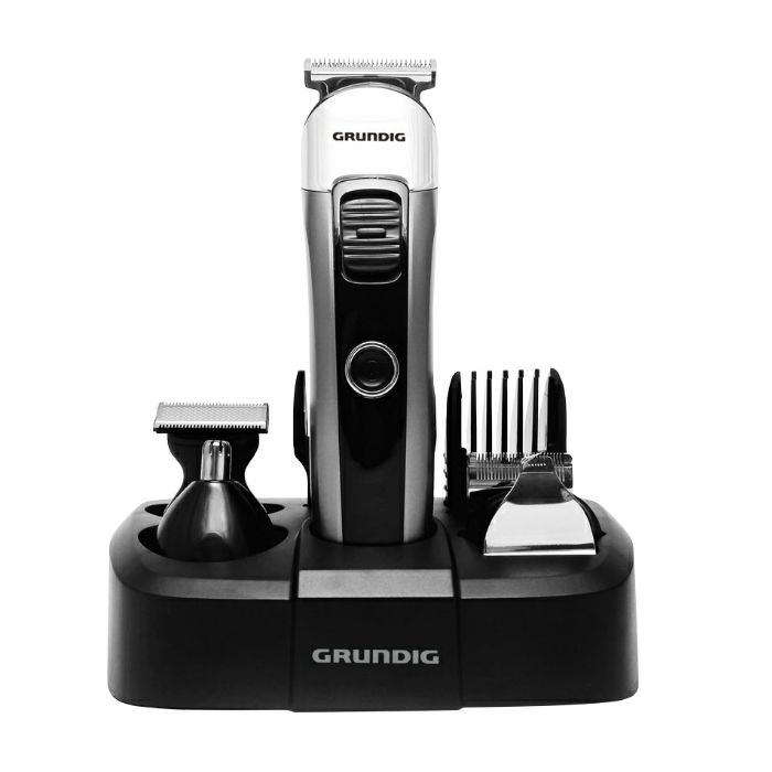 Grundig MGK 6841 Set za šišanje sa stalkom za punjenje Li-Ion tehnologija baterije Vrijeme rada baterije: 50 min Vrijeme punjenja: 120 min 5 izmjenjivih dodataka: - trimer za bradu - detaljni trimer - nastavak za više oštrica - T-oštrica - dodatak za trimer za nos i uho 3 češlja: - češalj 1 (1,0, 1,5, 2,0 mm) - češalj 2 (4, 6, 9, 12, 15, 18 mm) - češalj 3 (13, 15, 17, 19, 21, 23 mm) Higijenski perivi nastavci LED zaslon Opcija USB punjenja Boja: srebrna / crna