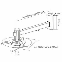 PM-105Stalak za projektor SBoxNosivost: do 10kgUdaljenost od zida: 475-655 mmOkomiti nagib: +15°to -15°Okretanje: 360°Montaža: Na zid