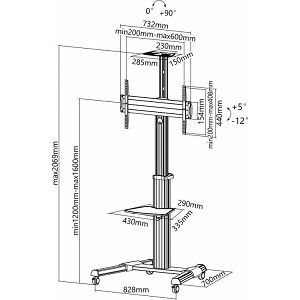 FS-446 Stalak za TV SBox Pokretni podni stalak za televizore Veličina ekrana: 37" - 70" / 92 - 178 cm VESA: 200x200, 400x200, 300x300, 400x400, 600x400 Nosivost: do 50 kg Vertikalni nagib: +5° - 12° Rotacija: 0-90° Podešavanje visine Polica za DVD Nosivost police: 5 kg Mogućnost montiranja kamere Ugrađeni kotačići Boja: crno/srebrna Materijal: čelik, aluminij, plastika Dimenzije: 828 x 700 x 2069 mm