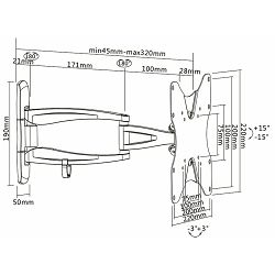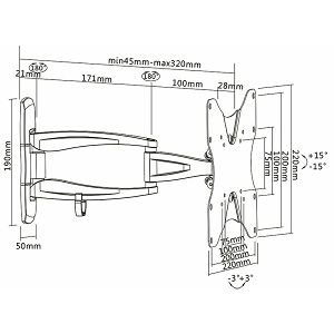 LCD-223NStalak za TV SBoxVeličina ekrana: 23“ - 42“Nosivost: 20 kgMontaža: VESA 200 x 200Udaljenost od zida: 45-320 mmOkomiti nagib: ± 15°Okretanje: 180°+180°Netto težina: 1,57 kg