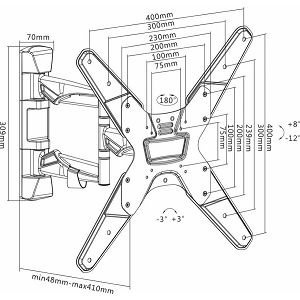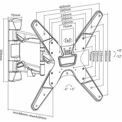 PLB-2044 Stalak za TV SBox Zidni stalak za zakrivljene ekrane Za veličine ekrana: 23" - 55" / 58 - 140 cm Nosivost: do 30 kg Montaža: od VESA 75x75 do VESA 400x400 Udaljenost od zida: 48 - 410 mm Okomiti nagib: -12° do +8° Vodoravni nagib: 180° + 360° + 180° Ugrađeni držači kablova