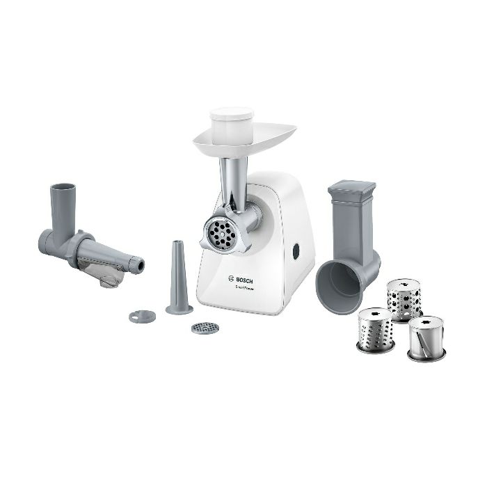 Uređaj za mljevenje mesa SmartPower 350 W Boja: bijela MFW2517W Sigurnosni zabravljeni spoj Gumene nožice Jednostavan za spremanje Diskovi: 3,8 mm / 8 mm Nastavak za kobasice Nastavak za usitnjavanje, tri spremnika Cjedilo za agrume Težina: 1.7 kg