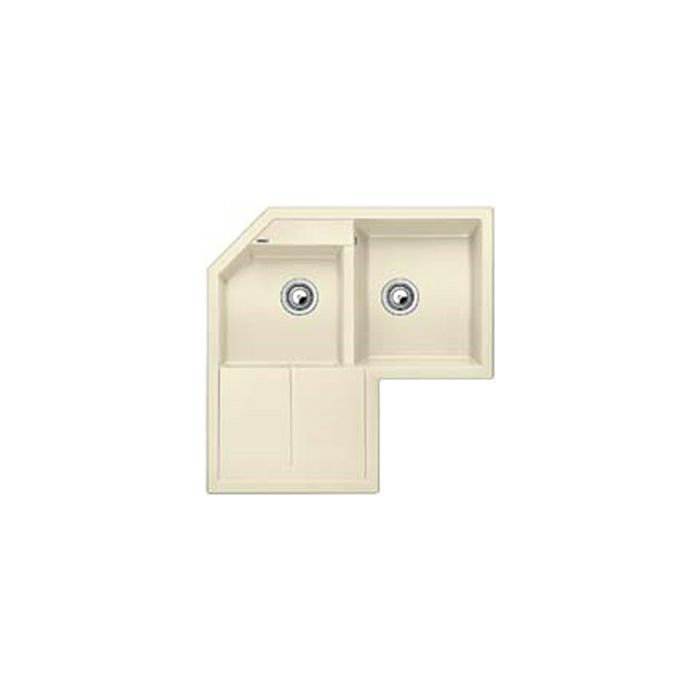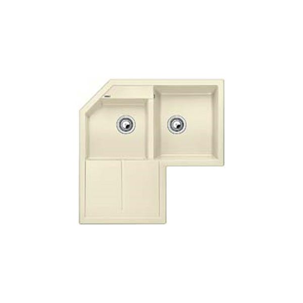 Silgranit PuraDur II Sudoper za ugradnju u kut kuhinje Ravni oblici mladolikog izgleda Posebno velik glavni bazen i dodatni bazen Dio za cjeđenje može služiti i kao radna podloga Dva košarasta ventila Odvodna garnitura sa cijevi koja štedi prostor Dimenzije sudopera: 830 x 830 mm Boja: jasmin
