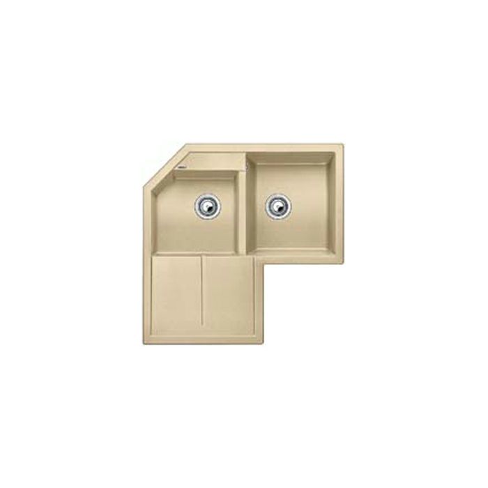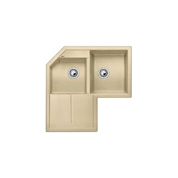 Silgranit PuraDur II Sudoper za ugradnju u kut kuhinje Ravni oblici mladolikog izgleda Posebno velik glavni bazen i dodatni bazen Dio za cjeđenje može služiti i kao radna podloga Dva košarasta ventila Odvodna garnitura sa cijevi koja štedi prostor Dimenzije sudopera: 830 x 830 mm Boja: šampanjac