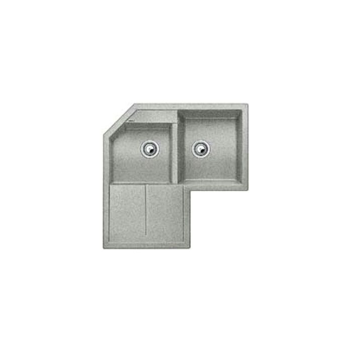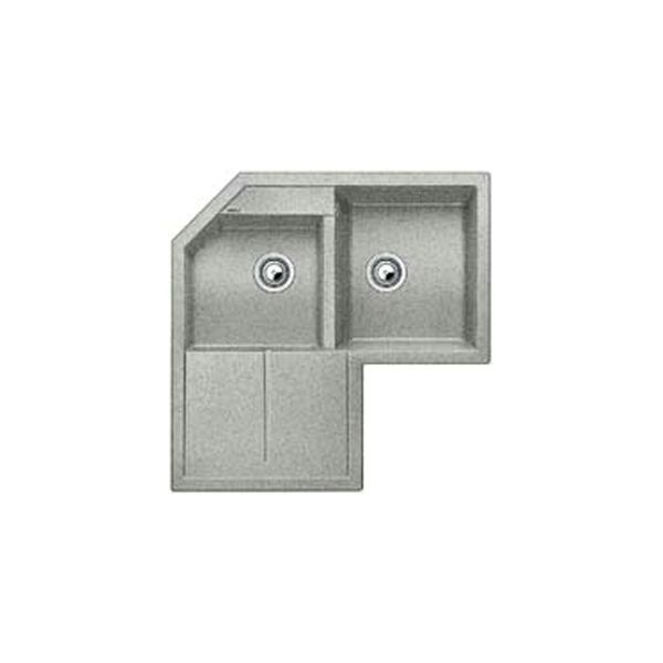 Silgranit PuraDur II Sudoper za ugradnju u kut kuhinje Ravni oblici mladolikog izgleda Posebno velik glavni bazen i dodatni bazen Dio za cjeđenje može služiti i kao radna podloga Dva košarasta ventila Odvodna garnitura sa cijevi koja štedi prostor Dimenzije sudopera: 830 x 830 mm Boja: siva boja kamena