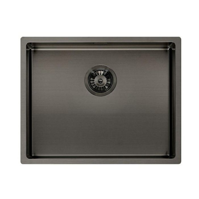 Miami 50x40 gun metal Sudoper Reginox Inox u boji, PVD tehnika Radijus: 10 mm Ugradnja u ormarić: 60 cm Dimenzije: 540 x 440 mm Izrez: 520 x 420 mm Dubina korita: 200 mm Izljev iz sudopera 3,5" Tanki rub, reverzibilan Sifon nije uključen u cijenu i kupuje se zasebno