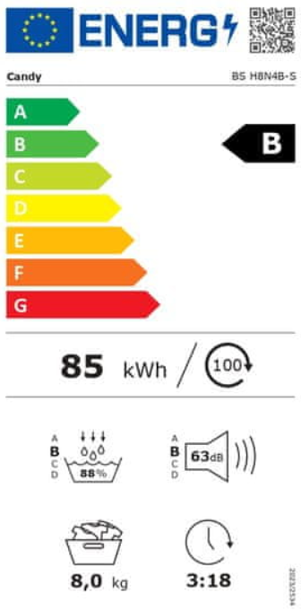 Energetska klasa: B Potrošnja energije - pun kapacitet (kWh): 1,3 Klasa učinkovitosti sušenja (od G kao najmanje do A kao najveće): A