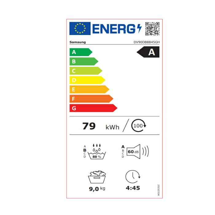 SAMSUNG sušilica rublja DV90DB8845GHU4 (A) BESPOKE, AI Control Energetski učinkovito sušenje - štedite energiju i vrijeme Ova sušilica razreda A nudi kapacitet sušenja od 9 kg, idealan za veće količine rublja. Tehnologija toplinske pumpe reciklira topao zrak, smanjuje potrošnju energije i čuva okoliš, a ukupna potrošnja za 100 ciklusa iznosi samo 79 kWh. Njena visoka učinkovitost kondenzacije (88%) osigurava brže i učinkovitije sušenje, dok razina buke od 60 dB čini rad izuzetno tihim.