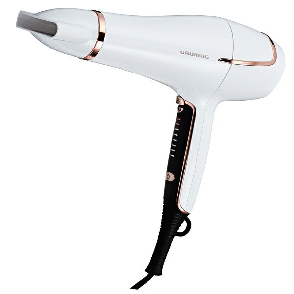 Grundig HD 7880 Senzor za kontrolu topline 8 postavki temperature 7 postavki brzine Hladno puhanje Ionska tehnologija LED prikaz postavki temperature i brzine puhanja Kontrola na dodir za upravljanje temperaturom Uska mlaznica za oblikovanje s otvorom za senzor za kontrolu topline Odvojiva rešetka za ulaz zraka Kabel duljine 1,8 m s prstenom za vješanje Boja: bijela / ružičasto zlatna