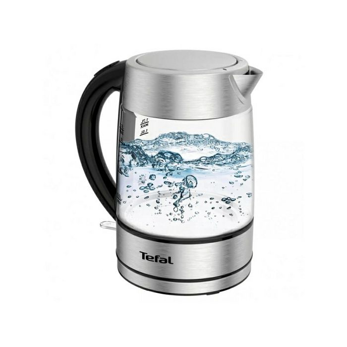 Stakleno kuhalo za vodu Tefal 1,7 L s dijelovima od nehrđajućeg čelika Tefal stakleno kuhalo za vodu izrađeno je od čistog i prirodnog staklenog materijala koji čuva autentični okus mineralne vode.